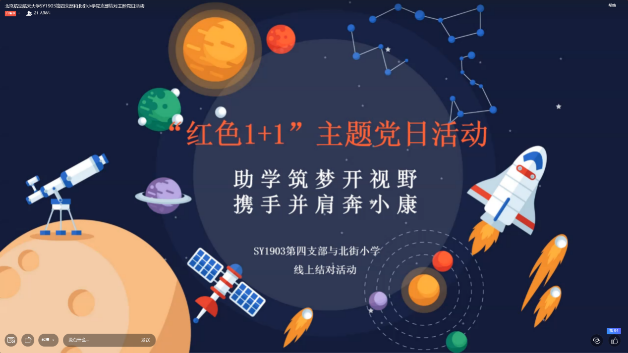 10月14日下午,自动化科学与电气工程学院研究生党支部与山西省中阳县北街小学开展“红色1+1”结对主题党日活动。本次活动以“助力筑梦开视野,携手并肩奔小康”为主题,包括“北航之缘”、“三系之奇”、“京都之美”、“携手之行”四个部分的内容,以线上钉钉直播形式开展。北街小学党支部100余名教师、来自46个班级的2300余名学生、以及自动化学院研究生党支部成员参加了本次活动,活动由学院SY1903第四党支部承办。