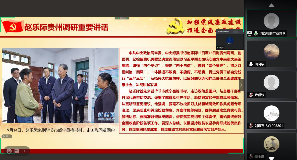 SY19038第九党支部于2020年9月23日晚7:00线上开展了“反腐倡廉每季一课”党课学习。本次学习由党支书曲晓宇同志主持,支部共有党员10人,参加活动10人,其中正式党员7人,预备党员3人。