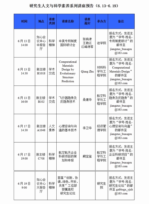 为提升我校研究生文化素养,培养研究生科学精神,促进研究生学术交流,营造具有传统与时代结合、人文与科学融合的研究生创新文化,党委研究生工作部于2016年3月启动我校研究生人文与科学素养提升平台建设。每周在校园网和研究生院官网上对近期即将举行的人文与科学素养讲座、报告或相关活动进行预告,欢迎感兴趣的同学积极参与。