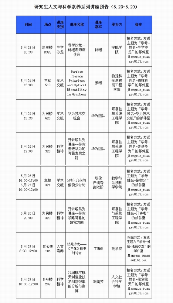为提升我校研究生文化素养,培养研究生科学精神,促进研究生学术交流,营造具有传统与时代结合、人文与科学融合的研究生创新文化,党委研究生工作部于2016年3月启动我校研究生人文与科学素养提升平台建设。每周在校园网和研究生院官网上对近期即将举行的人文与科学素养讲座、报告或相关活动进行预告,欢迎感兴趣的同学积极参与。