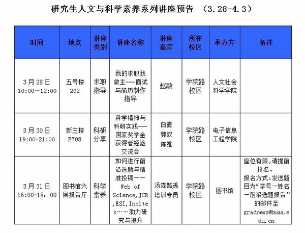 为提升我校研究生文化素养,培养研究生科学精神,营造具有传统与时代结合、人文与科学融合的研究生创新文化,党委研究生工作部于2016年3月启动我校研究生人文与科学素养提升平台建设。每周在研究生院官网上对近期即将举行的人文与科学素养讲座、报告或相关活动进行预告,欢迎感兴趣的同学积极参与。