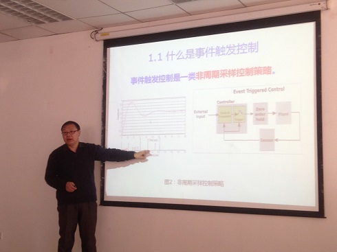 在报告中上,郝老师首先对什么是事件触发控制进行了概念性的介绍,随后分析了事件触发问题的优缺点、发展历史以及分类;同时针对积分型事件触发和受扰系统的事件触发分别进行了分析,同时介绍了ZENO行为,对如何避免ZENO行为进行了阐述;在报告的结尾老师还向我们介绍了老师针对本领域已经研究的工作以及该领域今后的发展等。