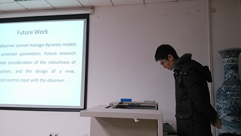 接下来博士徐龙做了学术报告,他的研究领域是目标跟踪和识别。他指出在多雷达数据处理系统中,雷达本身的系统误差是影响目标跟踪和数据融合质量的一个重要因素,因此如何解决误差配准成为一个关键问题。通过与传统的扩展卡尔曼滤波方法仿真比较,结果表明采用粒子滤波的方法解决非线性雷达误差配准模型行之有效,能有效地克服扩展卡尔曼滤波方法中很容易出现的滤波发散问题,性能高于扩展kalman滤波。报告内容清楚明白,现场氛围活跃。