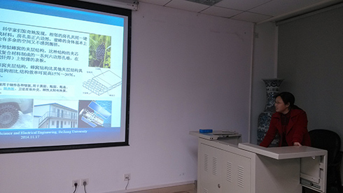 接下来为大家讲解的是纪占玲博士,她硕士期间主要研究现代设计方法与理论、液压控制研究。本次宣讲也主要讲了高温下的相变和塑性变形对金属蜂窝夹芯结构的固有性能的影响,以含相变的多层板瞬态热传递和热弹塑性理论为依据,采用有限元数值求解方法,对安装有发热元件的金属蜂窝夹芯结构进行了热和结构的非线性耦合分析。通过温度场分析,可以快速确定外胶层产生了固液和气液相变,及其开始出现的时间、位置、严重程度、发展趋势等。结合温度场和应力场的计算结果,可以方便地判定外蒙皮是否产生了塑性变形,并能预测其随加载时间的动态演化规律。虽然宣讲内容深奥难懂,但是纪占玲博士幽默风趣的报告方式还是让会场气氛融洽。